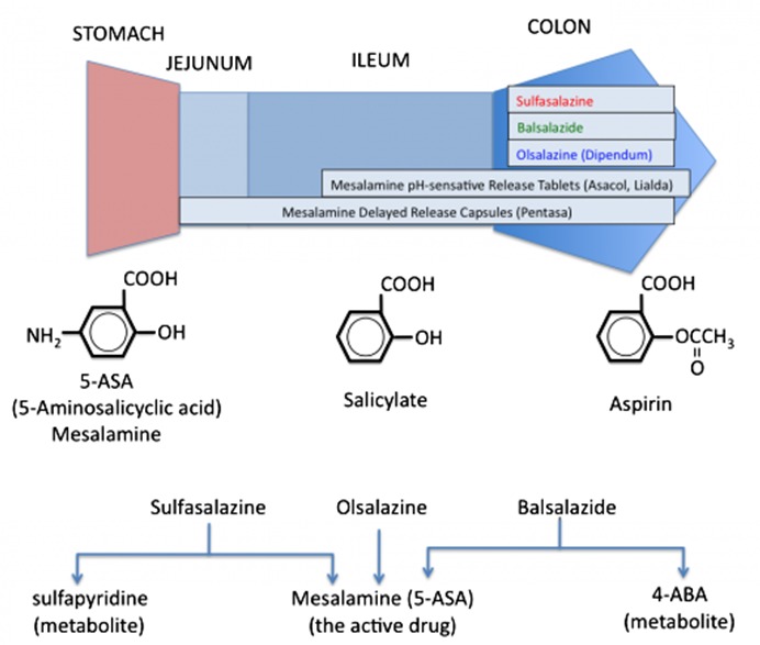 包含Sulfasalazine (Sulfapyridine + 5-ASA)、Mesalamine (5-ASA)
