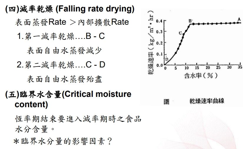 30. ⼀般物料在乾燥過程中,臨界水分含量(critical moisture content)會發生在乾燥速率曲線