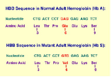 鐮型血球貧血症患者的α胜肽鏈完全正常,但其β胜肽鏈的DNA序列在起始端的第20個核苷酸發生點突變,由原來的三聯密碼子-GAG-變成-GTG-,因此在轉譯時,β胜肽鏈近N (前)端的第6個胺基酸,則由麩氨酸(glutamic acid)變成纈胺酸(valine)。