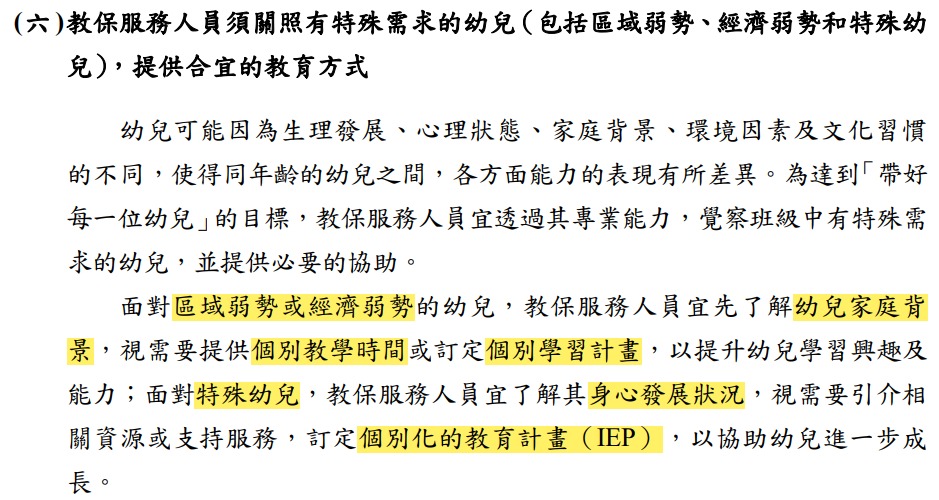 教保服務人員須關照有特殊需求的幼兒(包括區域弱勢、經濟弱勢和特殊幼兒),提供合宜的教育方式