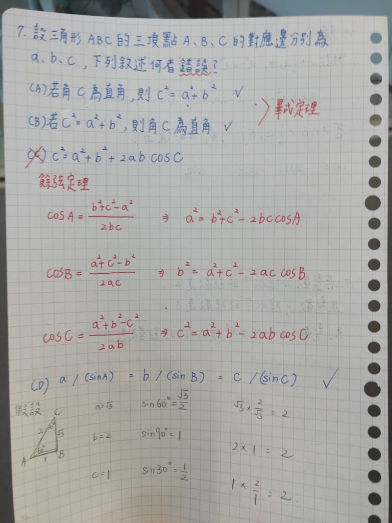 32.設三角形 ABC 的三頂點 A、B、C 的對應邊分別為 a、b、c,下列敘述 何者有誤?