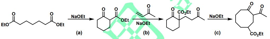 32. 下列合成包含三個反應,何種反應名稱是麥可反應(Michael reaction)?
