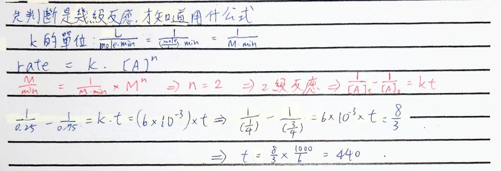 32. 反應 3A →2B 的速率常數為 6.00 ✖ 10-3 L mol-1min-1。反應物 A 的濃度從 0.75M 下降到 0.25M 需要 多久時間?