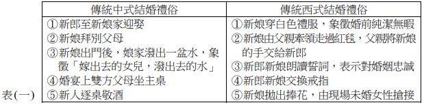 (D) 根據表(一)內容,傳統西式禮俗符合性別平等概念的項目比中式多