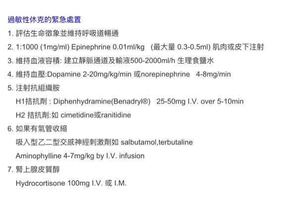 (B)epinephrine (1 : 1000) 0.3~0.5 mg 靜脈注射
