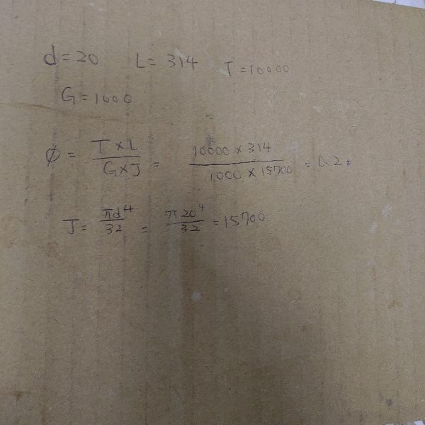 33. 如圖 ( 十四 ) 所示的實心圓軸,已知直徑 d = 20 mm,長度 L = 314 mm,自由端承受的扭矩 T = 10000 N-mm,剪力係數 ( 即剛性係數 ) G = 1000 MPa,則實心圓軸的最大扭轉角 Φ 為多少rad?( π = 3.14 )
