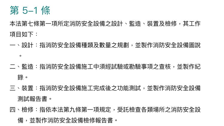 34 依消防法施行細則,有關消防安全設備之設計、監造、裝置及檢修工作項目之規定,下列何者正確?