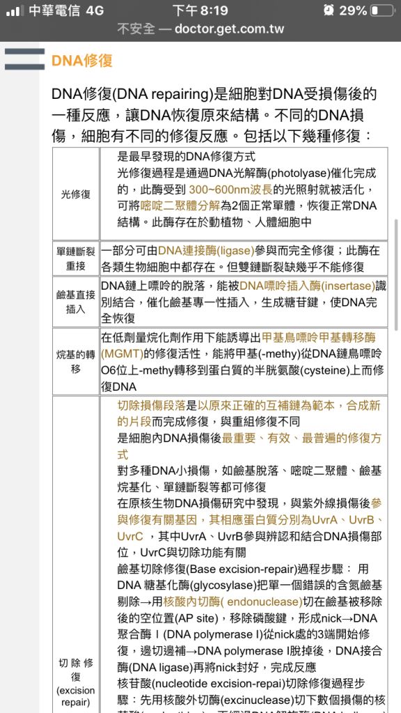 (C)直接修復(direct repair)可修復化學物質或光化學反應所造成之 DNA 損傷