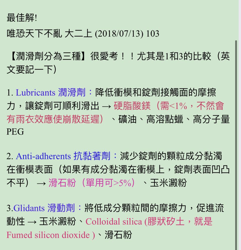 順帶一提,果仁大的glidant舉例中,其實talc不該被歸為此類,glidant在國考中出現過的是 膠性矽土(fumed-silicon)