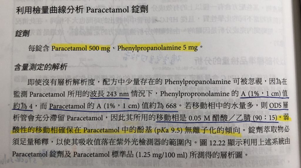 Watson 的課本中有提到這一個例題,弱酸性的移動相確保在Paracetamol的酚基(pKa9.5)無離子化的傾象