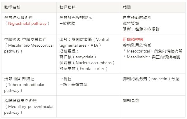 中腦皮質/邊緣 (Mesocoritcal&mesolimbic) | 情緒行為 | 治療Schizophrenia。 ※Mesocoritcal:與負向情緒有關 ※Mesolimbic:與正向情緒有關 |