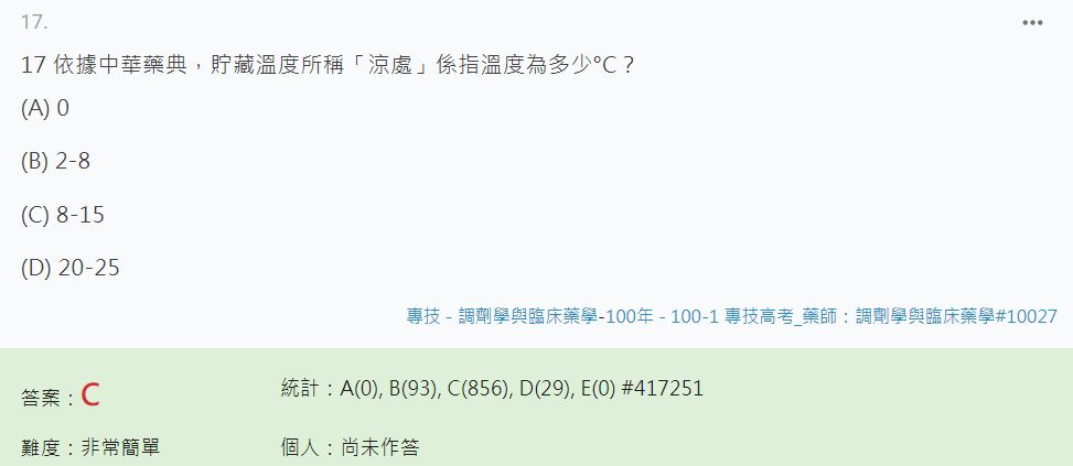 35.中華藥典規定藥品儲存溫度所稱之「涼處」是指約攝氏幾度?