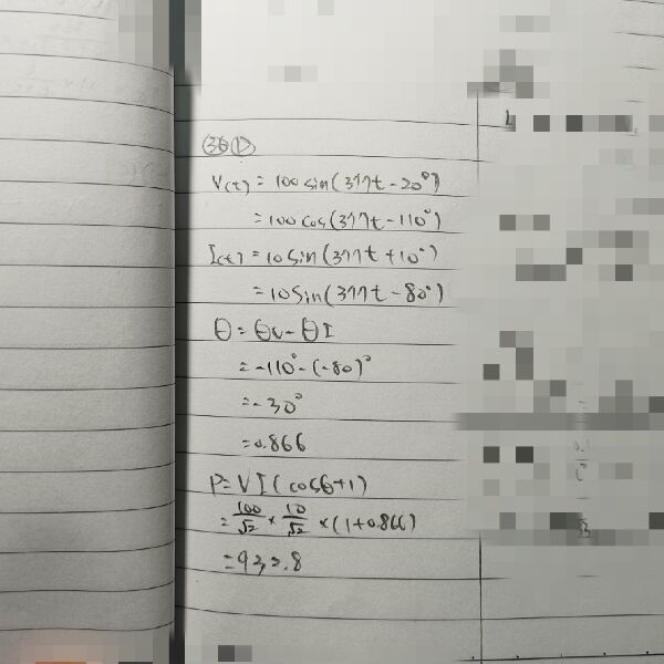 36 有一交流電路之電壓 v(t ) = 100sin(377t - 20°) V 、電流 i(t ) = 10sin(377t + 10°) A ,則其瞬時功率最大值