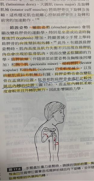36.站姿下,前位頭部(forward head)以及胸椎駝背(thoracic kyphosis)常伴隨錯誤的肩胛姿勢,造成肱骨
