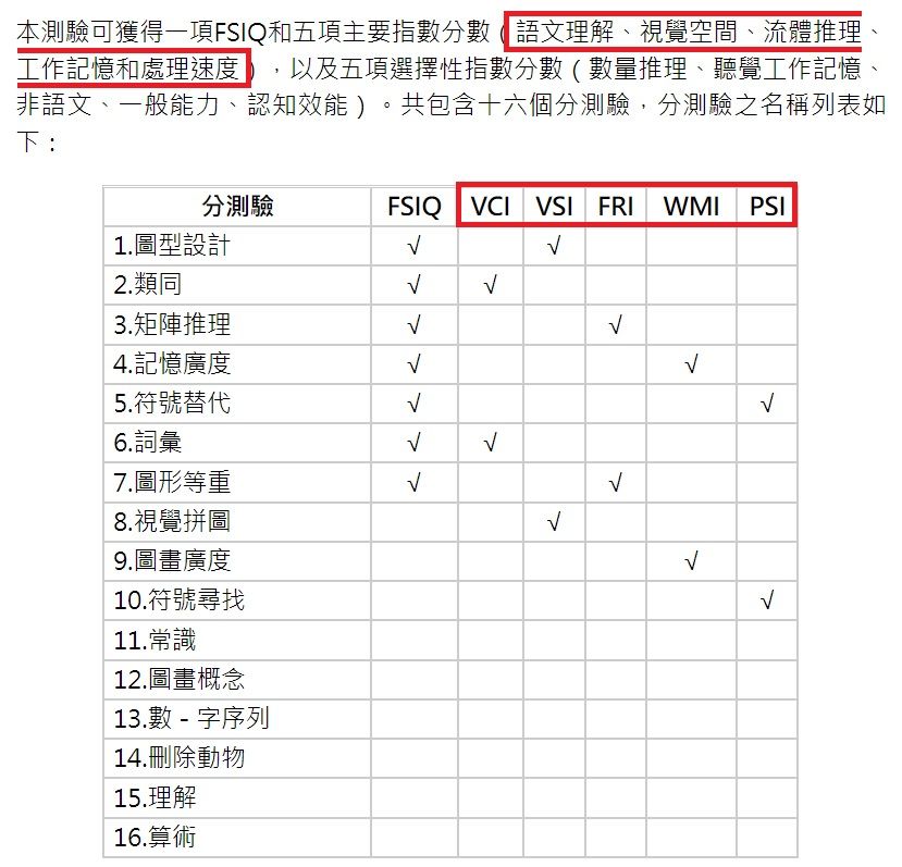 衛五 : 語文理解 + 視覺空間 + 流體推理 + 處理速度+工作記憶