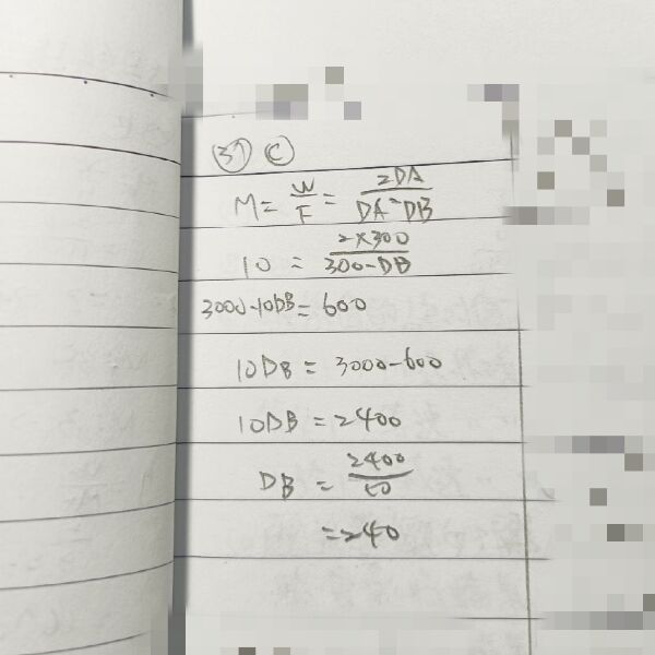 形下,其機械利益為 10,若該滑車定滑輪中之大輪直徑為 300 mm,定滑輪中之小輪直徑為何?