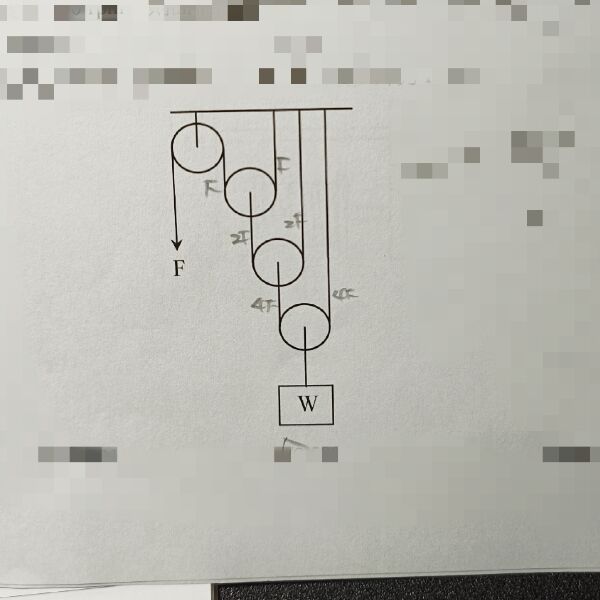 37 如圖所示之滑車系統,欲吊起 4000 N 之重物時,則應施加最少外力 F 為若干 N? F W