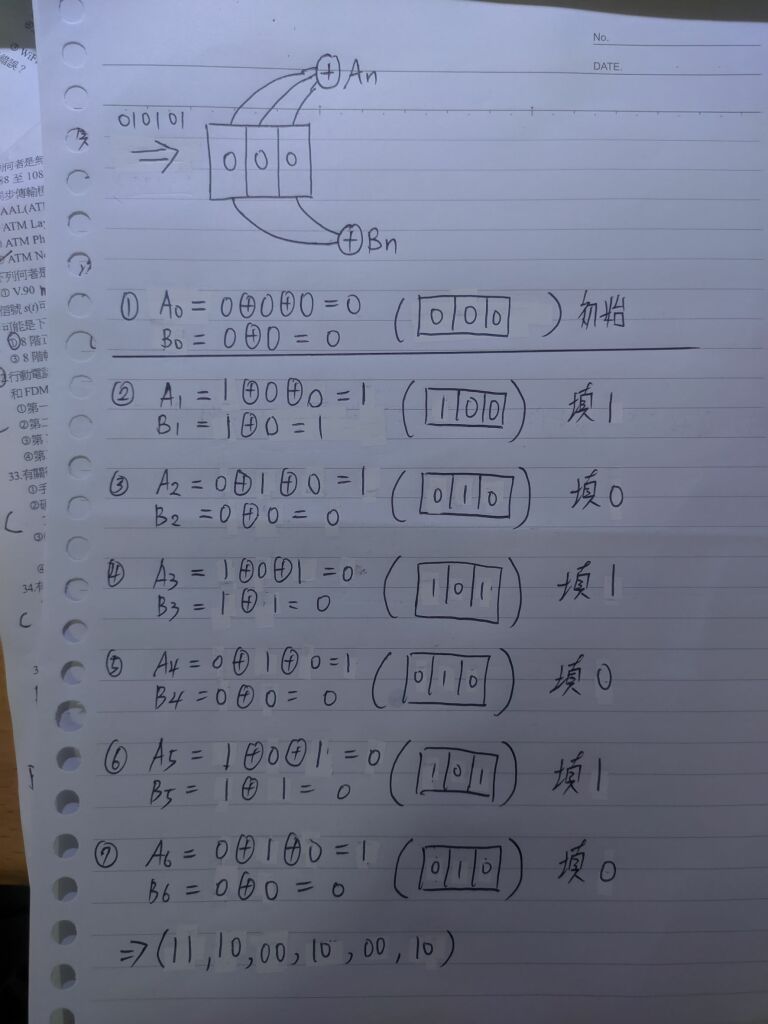 37.請問 W-CDMA 系統之頻道編碼(Channel Coding)使用迴旋編碼(Convolution Coding),假設有一個(2, 1, 3)迴旋碼,亦即一個輸入位元產生兩個輸出位元,用連續三個輸入位元計算出冗餘位元(亦即限制長度為 3),輸入與輸出的關係為An =Un⊕Un−1⊕Un−2和Bn =Un⊕Un−2,式中Un、Un−1、Un−2分別是目前和之前的兩個輸入位元,An和Bn是對應的兩個輸出 位元,⊕是 Exclusive OR 運算,若輸入位元序列是 1 0 1 0 1 0,輸出位元序列(A1B1, A2B2,…)為何?