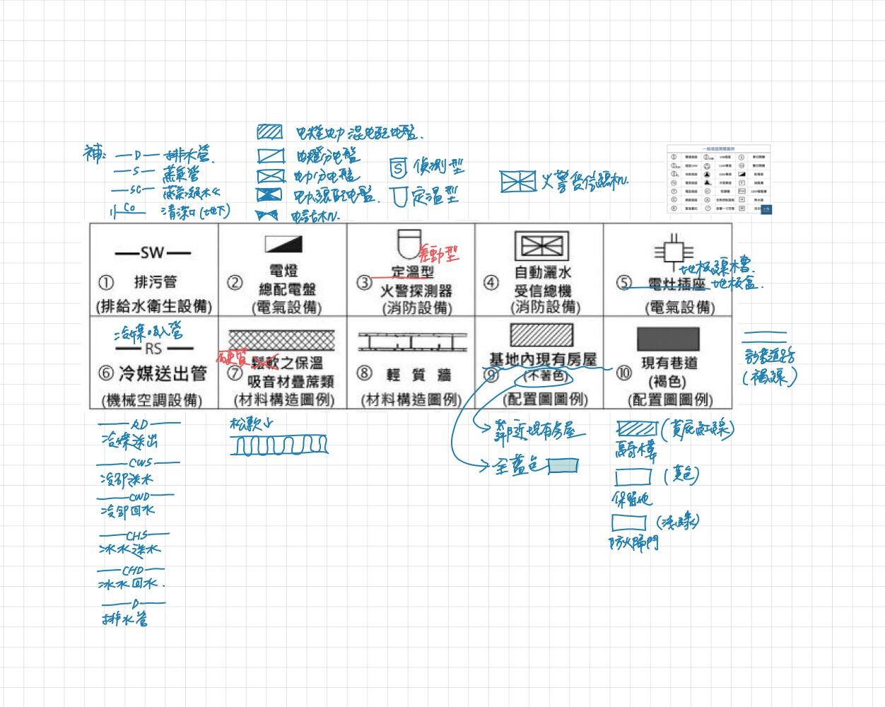 37. 某學生的圖學筆記中紀錄各類建築圖符號,下列圖例組合何者全部正確?