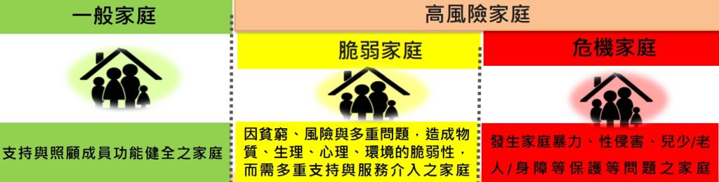 - 脆弱家庭:因貧窮、風險與多重問題,造成物質、生理、心理、環境的脆弱性,而需多重支持與服務介入之家庭。
