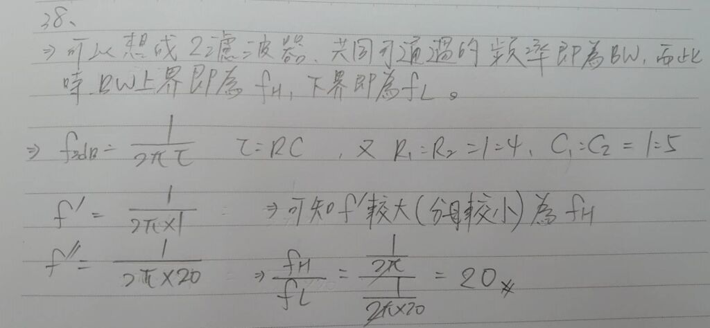 38. 如圖 ( 二十六 ) 所示主動式帶通濾波器,其高頻截止頻率為 ,低頻截止頻率為 ,若 C2 = 5C1, R2 = 4R1 ,則 為何? (A) 0.05 (B) 1.25 (C) 10 (D) 20