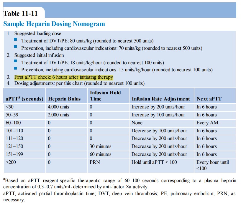 王爺爺74歲,因不穩定型心絞痛入院治療後又出現深層靜脈栓塞,檢驗數據Hct 36%,INR 1.02,aPTT 23.6 seconds,platelet count 260,000/mm3。如欲開始heparin治療,