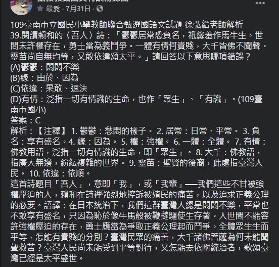 39.閱讀賴和的〈吾人〉詩:「鬱鬱居常恐負名,祇緣羞作馬牛生。世間未許權存在,勇士當為義鬥爭。一體有情何貴賤,