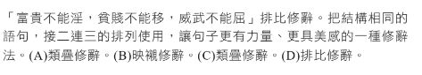 (B)「富貴不能淫,貧賤不能移,威武不能屈,此之謂大丈夫。」《孟子.滕文公》所使用的修辭為: