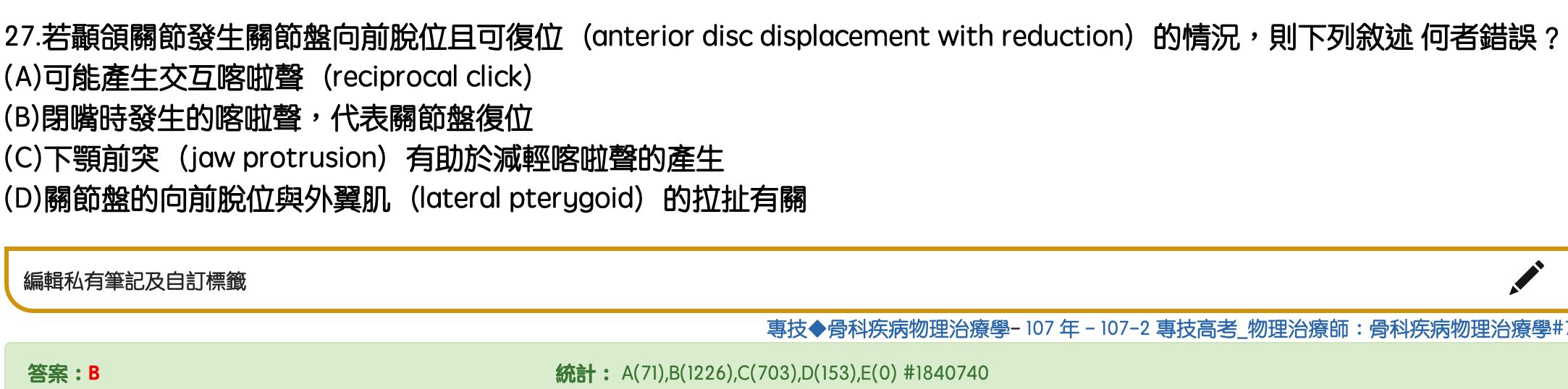 (B) 閉嘴時的喀嗒聲,通常是因附著在間盤(disc)的組織太緊 鬆弛