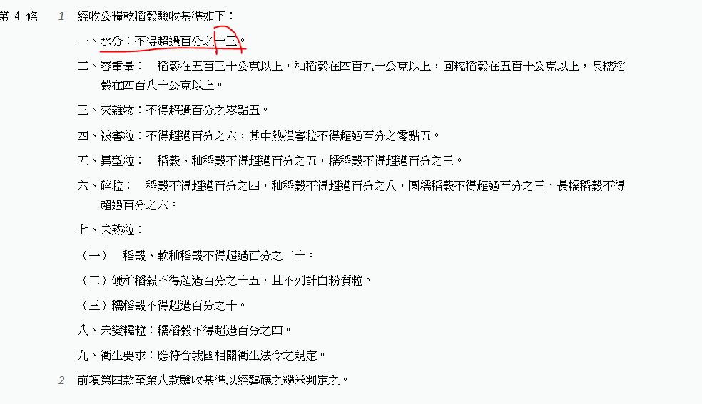 4. 經收公糧稻穀驗收基準規定水分不得超過百分之: