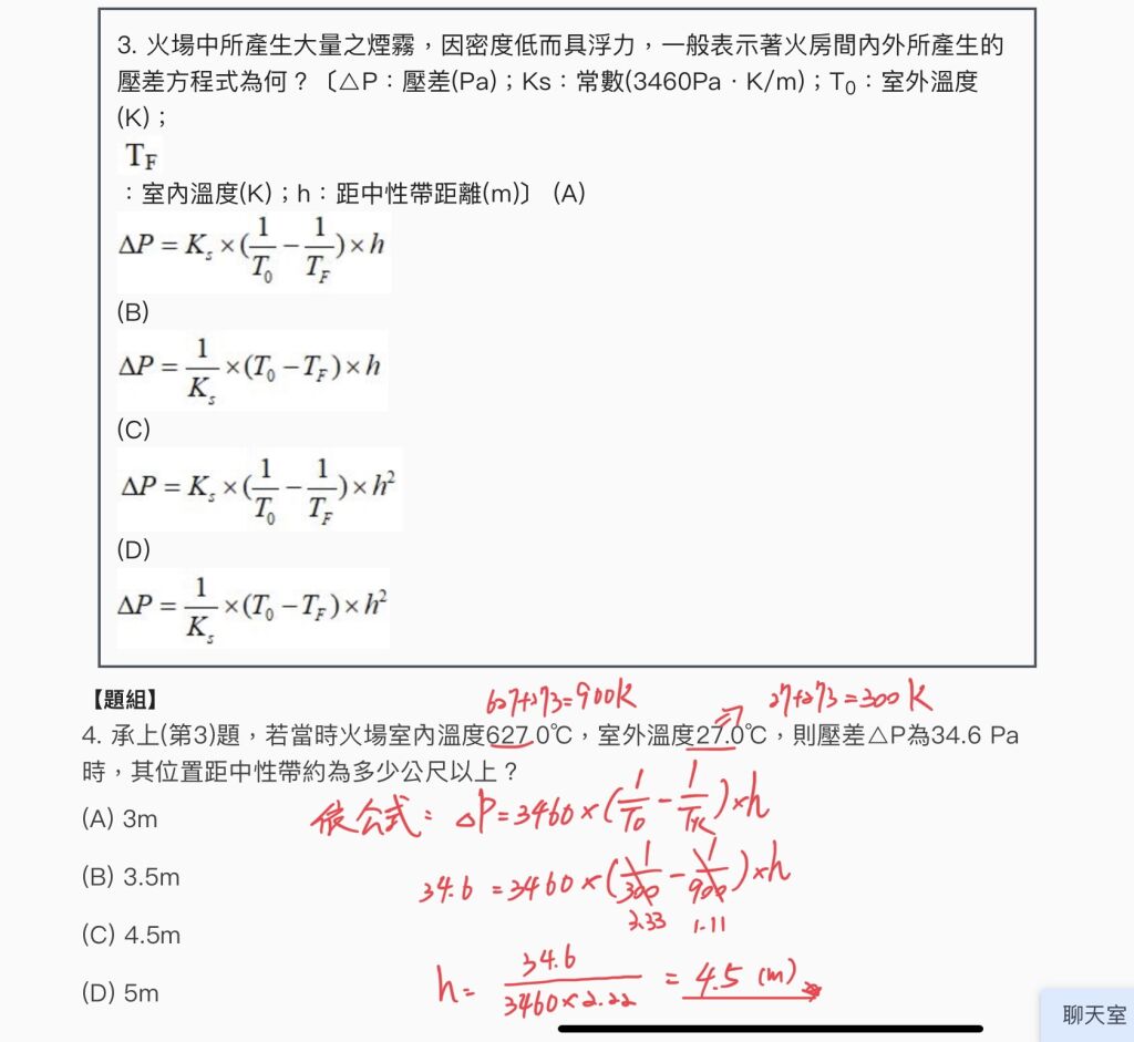 4. 承上(第3)題,若當時火場室內溫度627.0℃,室外溫度27.0℃,則壓差△P為34.6 Pa時,其位置距中性帶約為多少公尺以上?