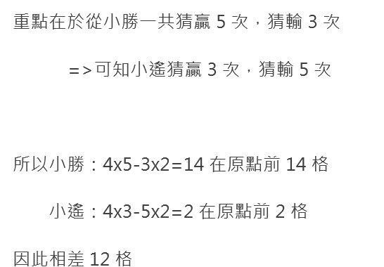 4. 小遙和小勝在玩大富翁,猜拳贏的人可以前進 4 格,輸的人則後退2格,小勝一共猜贏 5 次,猜輸 3 次。請問小遙和小勝之間相距幾 格?