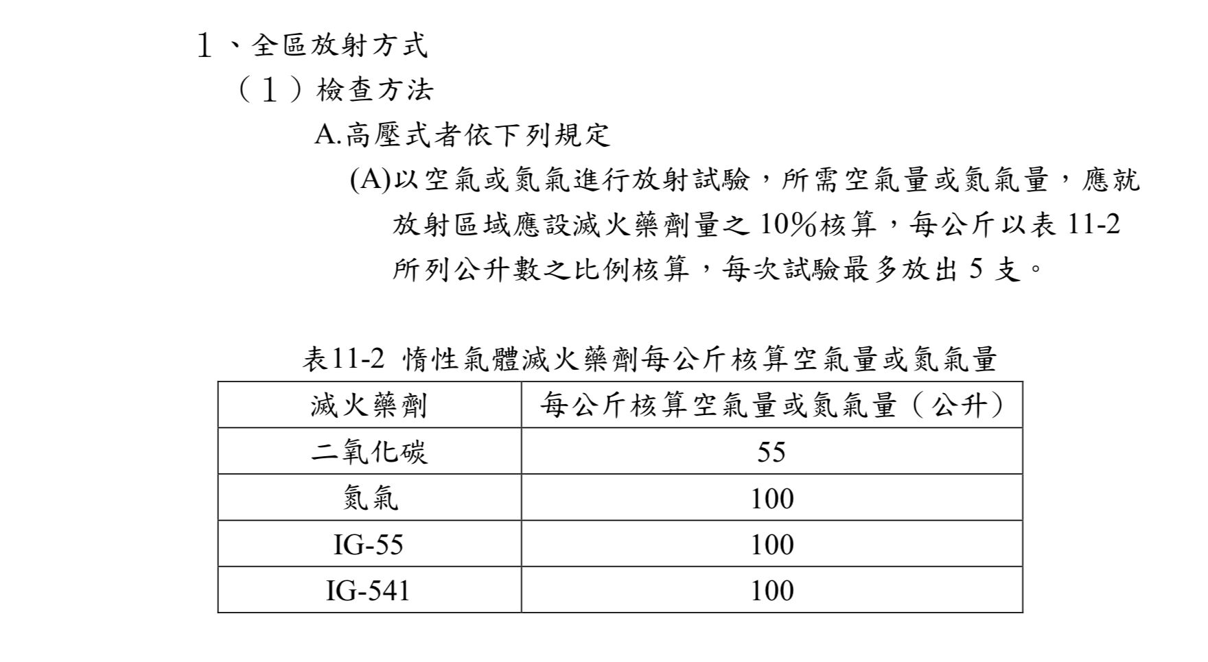 40 二氧化碳滅火設備採全區放射方式,採用高壓系統在進行綜合檢查時,以空氣或氮氣進行放射試