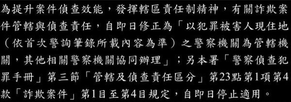(A)涉及帳戶匯款案件,由發生地之警察機關管轄,其他相關警察機關協同辦理。但同時涉及當面取款詐欺 案件者,統一由取款地之警察機關為主辦單位