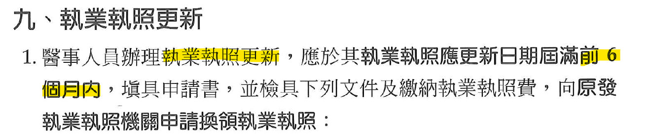 醫事人員辦理執業執照更新,應於其執業執照應更新日期屆滿前六個月內,填具申請書,並檢具下列文件及繳納執業執照費,向原發執業執照機關申請換領執業執照:一、原領執業執照。二、最近三個月內之一吋正面脫帽半身照片二張。三、執業所在地醫事人員公會會員證明文件。四、完成第十三條第二項所定繼續教育之證明文件...