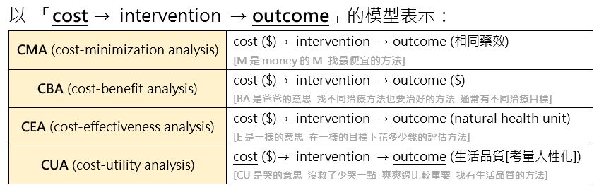 cost-effectiveness analysis:成本與療效進行綜合比較,通常都考這個,實際應用較廣
