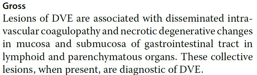 肉眼病變:各器官有刷狀出血,腹腔、胸腔血塊,腸道漿膜面潮紅、黏膜壞死、腸內容物有血塊、腸壁變薄、環狀出血,脾臟、胸腺、華氏囊出血,肝腎腫大、蒼白