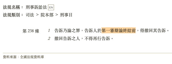 「告訴乃論之罪,告訴人於第一審辯論終結前,得撤回其告訴。 撤回告訴之人,不得再行告訴」,刑事訴訟法第238條定有明文。