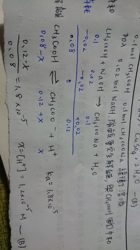 40. 一升溶液中含0.1莫耳 CH3COOH 和0.1莫耳 CH3COONa 的緩衝溶液,試求加入0.02莫耳 NaOH後,溶液之 [H+ ]=?(已知CH3COOH 之Ka=1.8×10-5 )