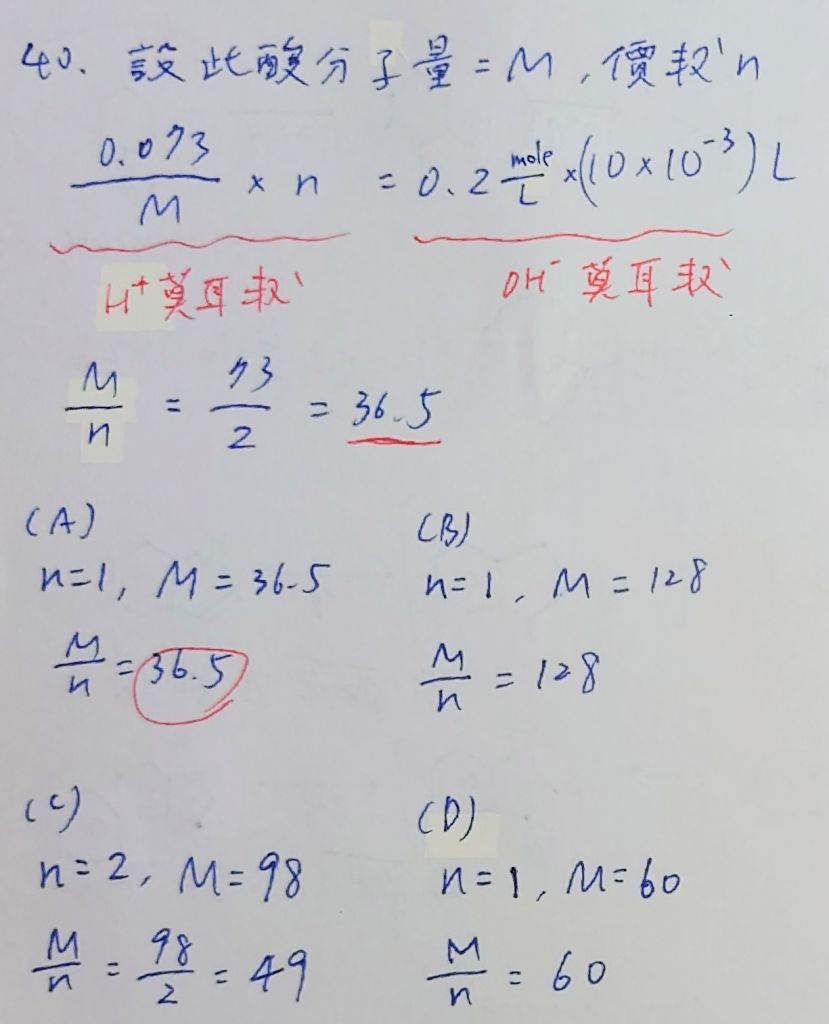 40. 常溫下,含 0.073 g 某酸之溶液 25 mL 需 0.200 M 氫氧化鈉溶液 10.0 mL 以達滴定當量點,請問此