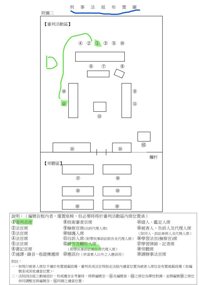 (D)刑事事件被告席位在審判長之左手邊下方