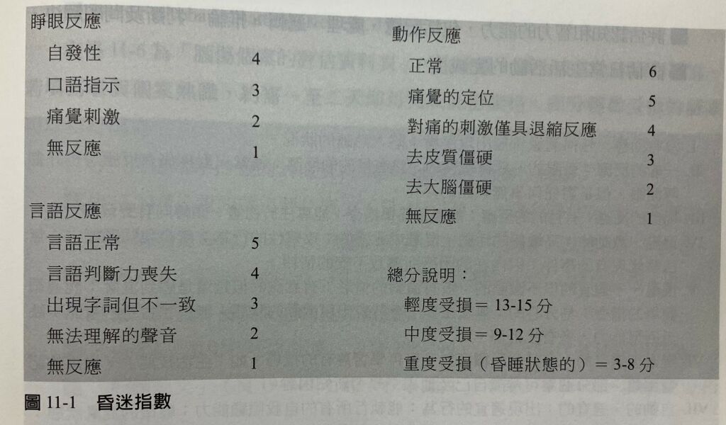 由睜眼、語言和運動三項動作評估後的總和,滿分為15分,表示警醒、機敏、意識清楚。