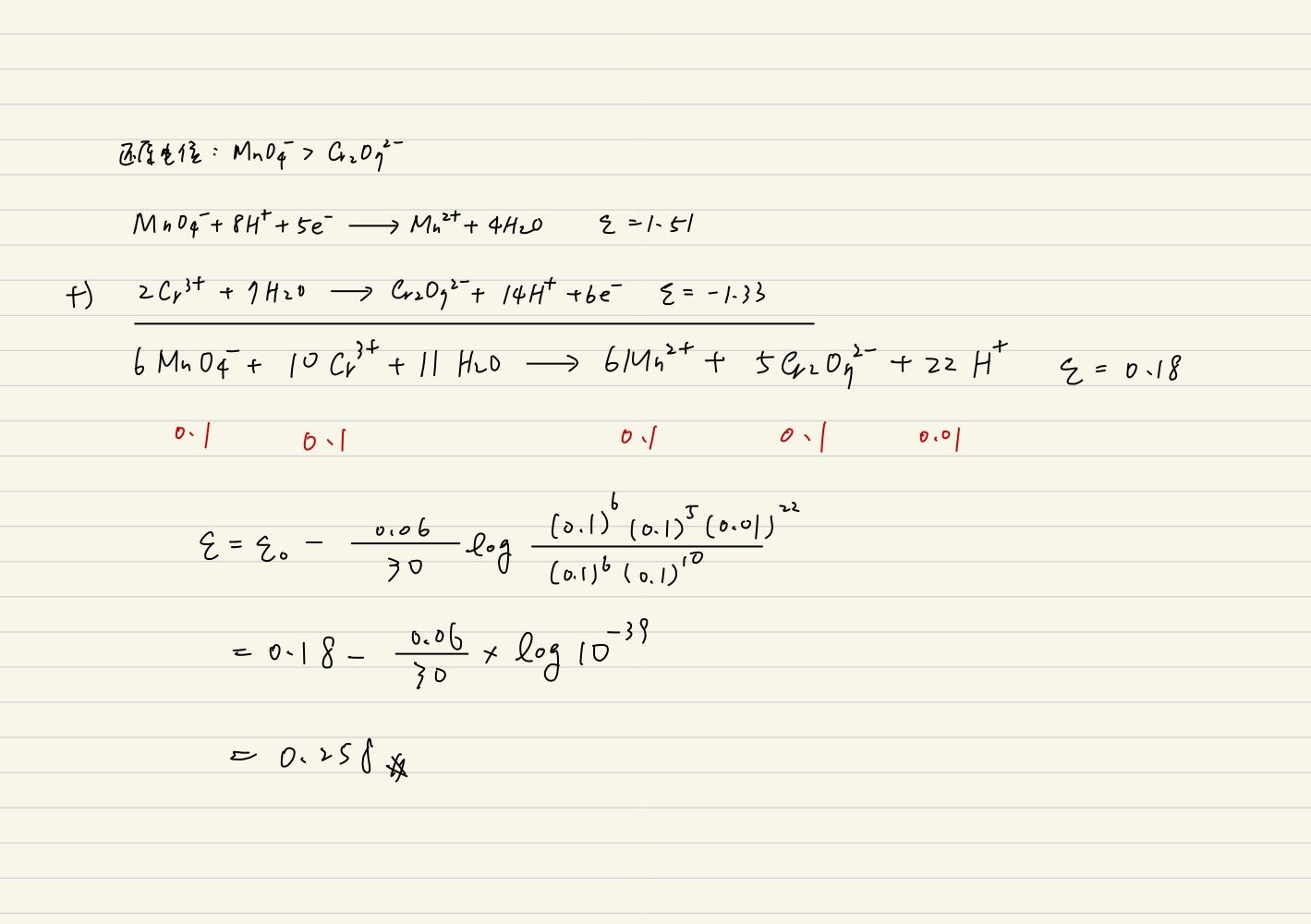 下列為 MnO4 –及 Cr2O72–的標準還原電位: MnO4– + 8H+ + 5e– →Mn2+ + 4H2O ℰ° = 1.51 V Cr2O72– + 14H+ + 6e–→ 2Cr3+ + 7H2O ℰ° = 1.33 V 25°C 下此電池的電位是多少伏特?