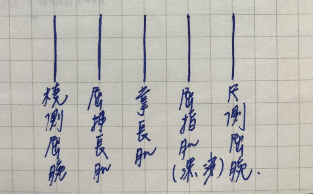 腕隧道裡:正中神經,屈拇長肌,屈指深肌,淺肌肌腱