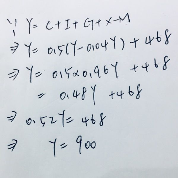 43 如果有一國的經濟體系是採用簡單凱因斯模型,此國的消費函數為 C(Y-T)=0.5(Y-T),投資為 I=468, 稅收函數為 T=T0+0.1Y 且 T0=G=0。最近因為景氣不好,政府打算降低所得稅率,使得稅收函數變成 T=T0+0.04 Y,則均衡所得為何?