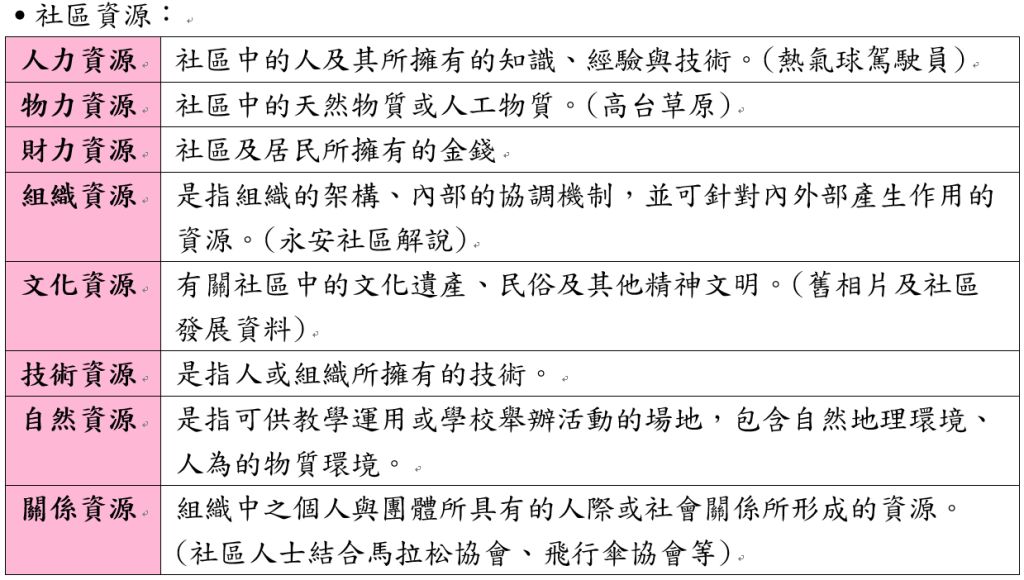 自然資源是指可供教學運用或學校舉辦活動的場地,包含自然地理環境、人為的物質環境等。