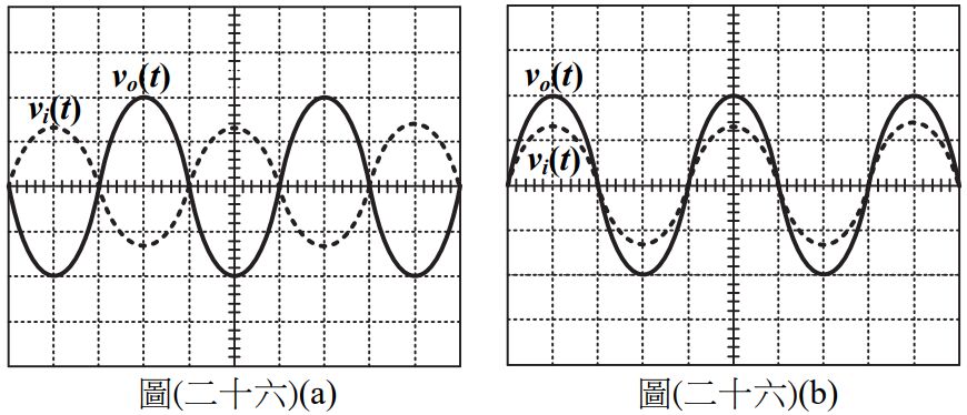 43. 學生進行二個BJT放大電路實驗,示波器輸入耦合設定於AC檔位、波形反相(INV)功能為關閉(OFF)且適當地設定測試棒衰減比,若測得輸入 vi(t) 與輸出vo(t) 信號如圖(二十六)(a)及(b)所示,則下列敘述何者正確?
