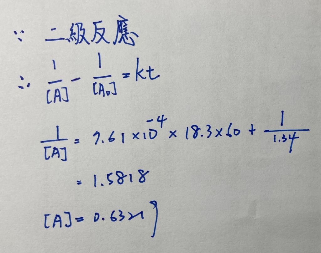 43. 2A → B為二級反應,若A的起始濃度為1.34 M,反應速率常數k = 7.61 × 10–4s–1,請問18.3分鐘後,A濃度應為多少?