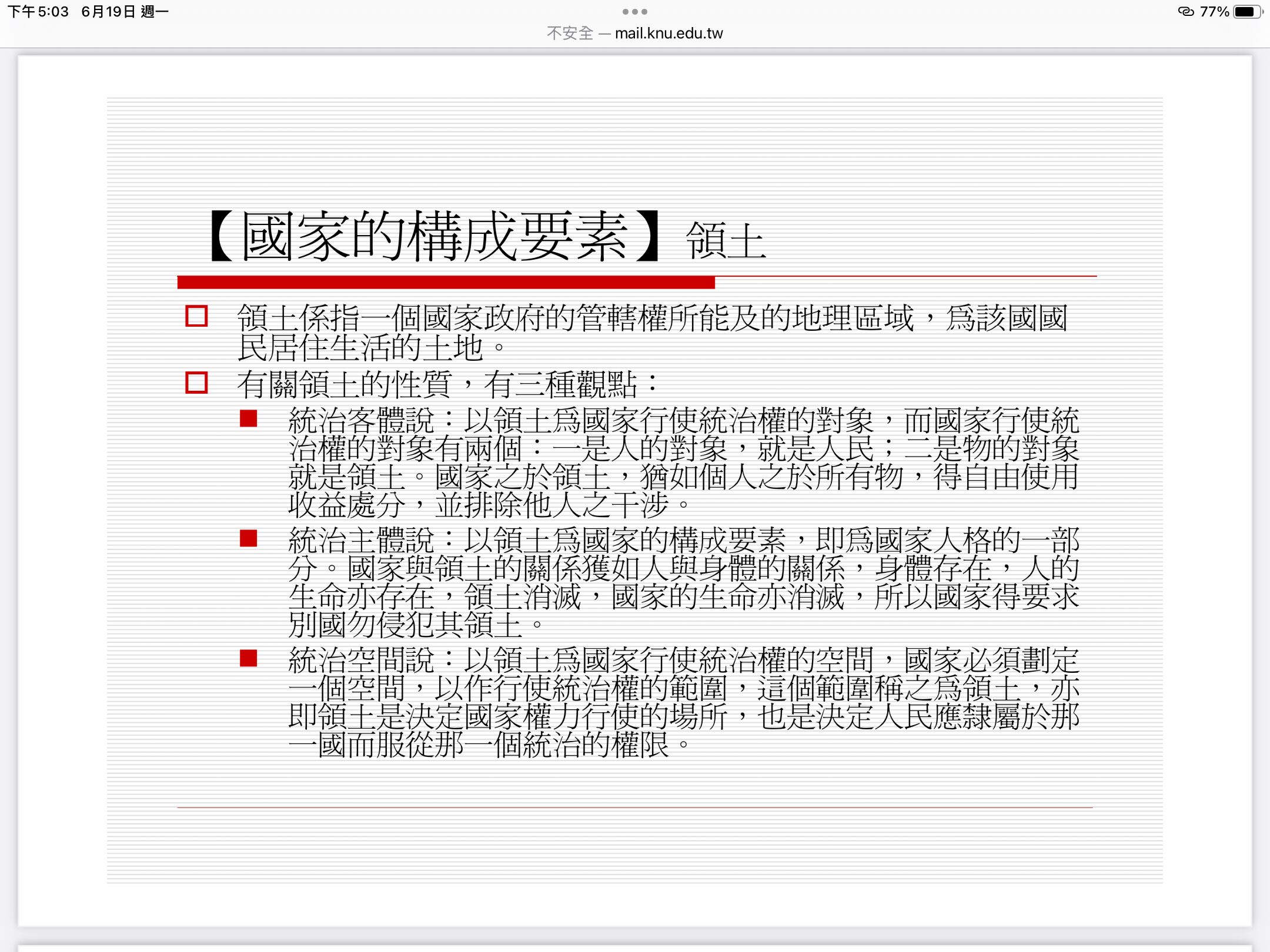 領土的三種學說1.統治主體說(人格構成說...