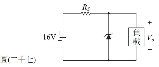 44. 如圖(二十七)所示電路,稽納二極體(Zener diode)最大額定功率為60 mW、崩潰膝點電流IZK=0.5mA,且崩潰電壓VZ=6 \)V。忽略稽納電阻,在正常穩壓狀態下維持 Vo=6V,若負載功率PL=60 mW,則限流電阻RS最小值為何?